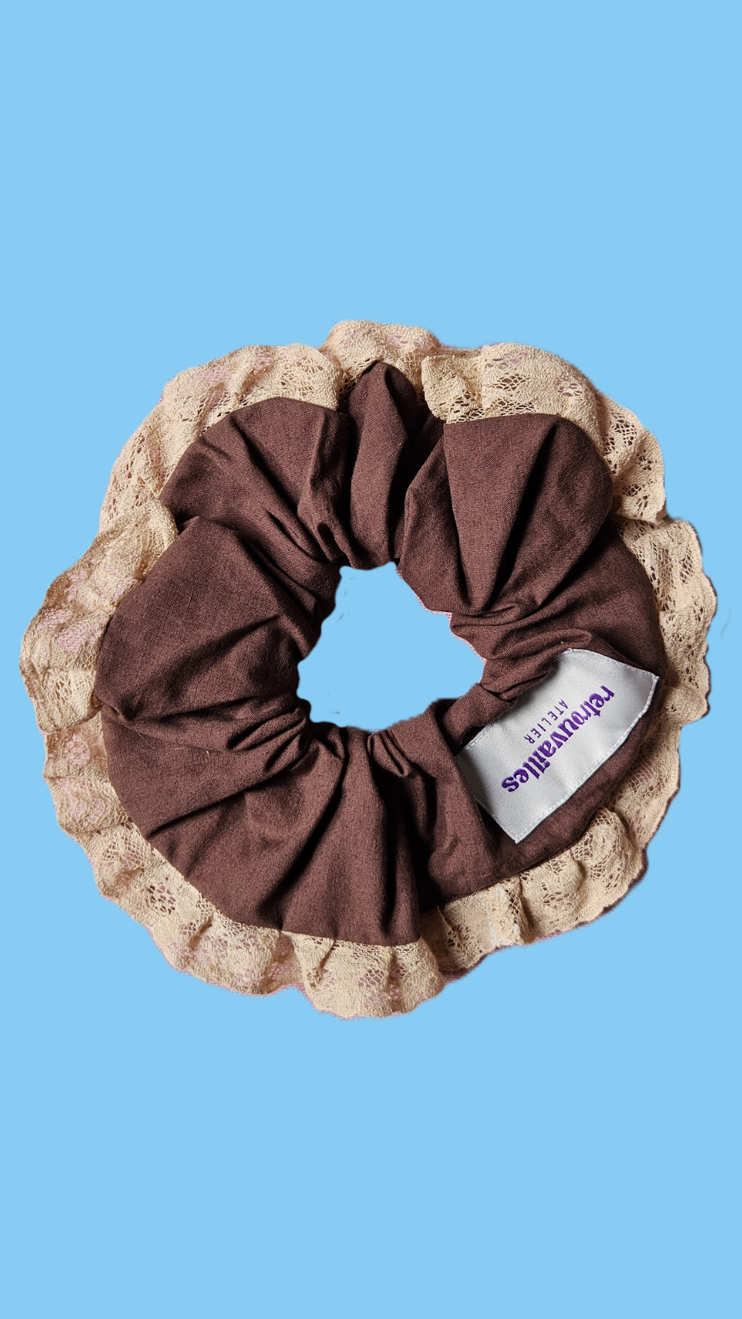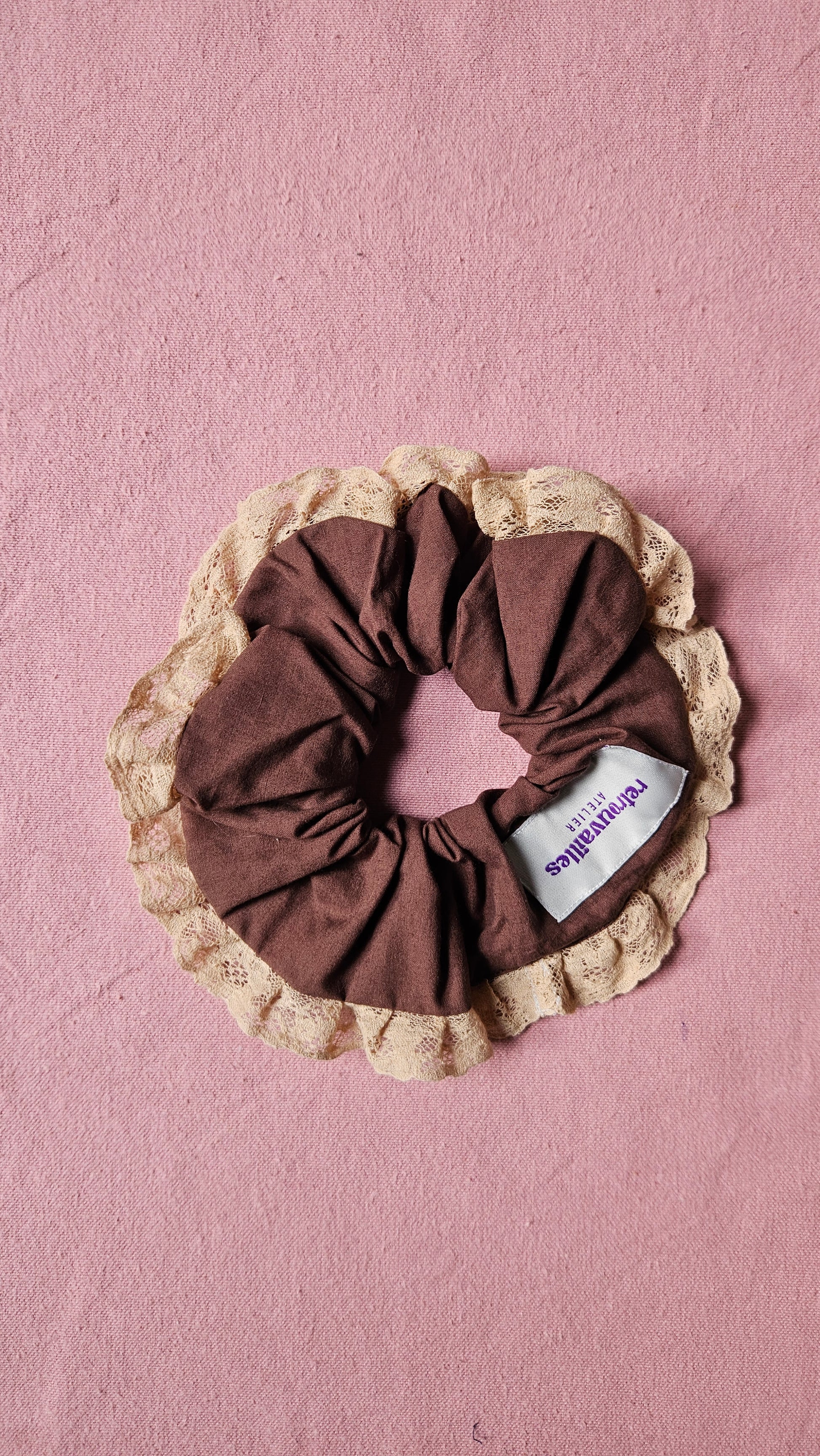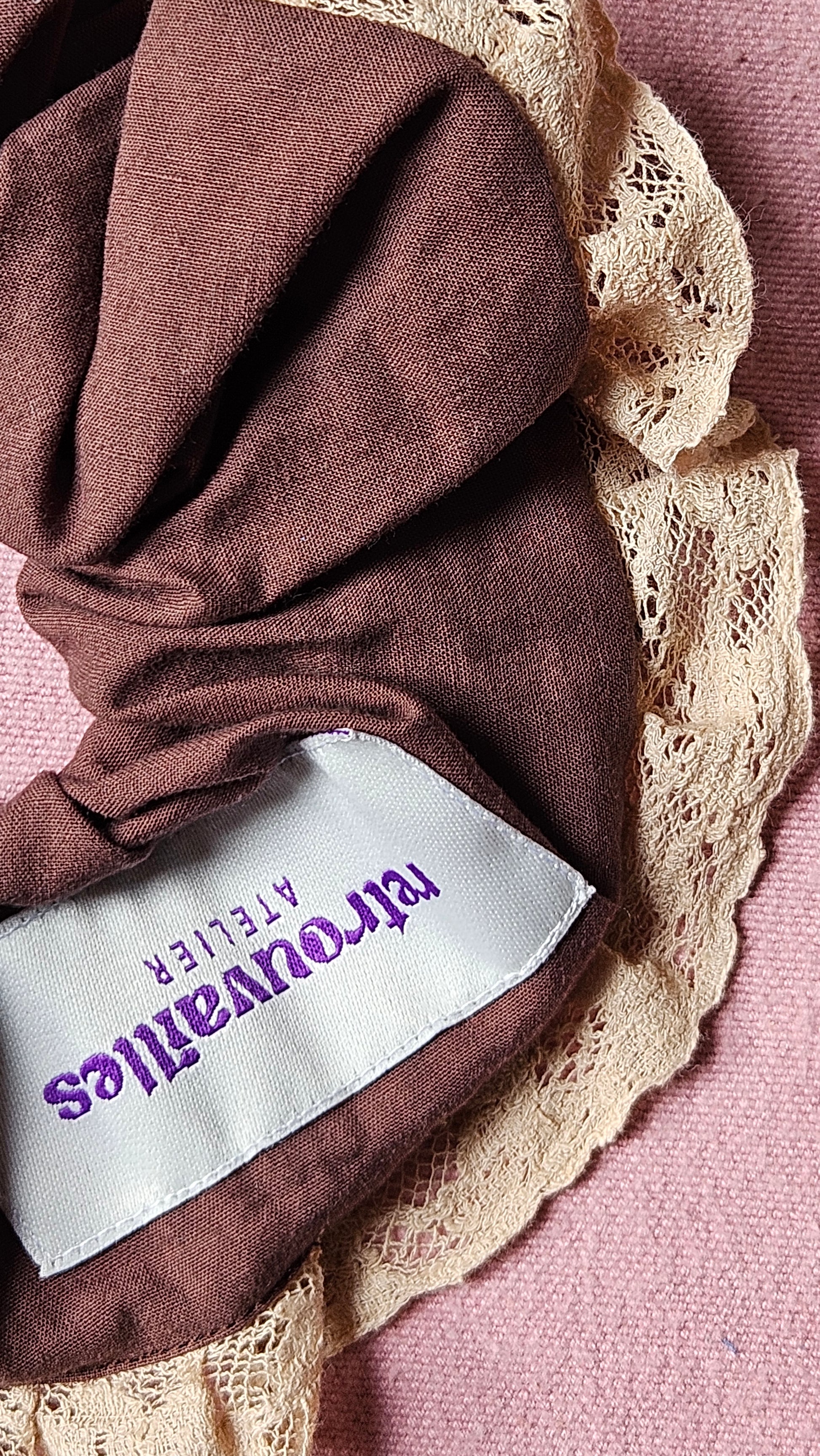 Chouchou XL créé à partir d'un drap et d'une dentelle vintage.