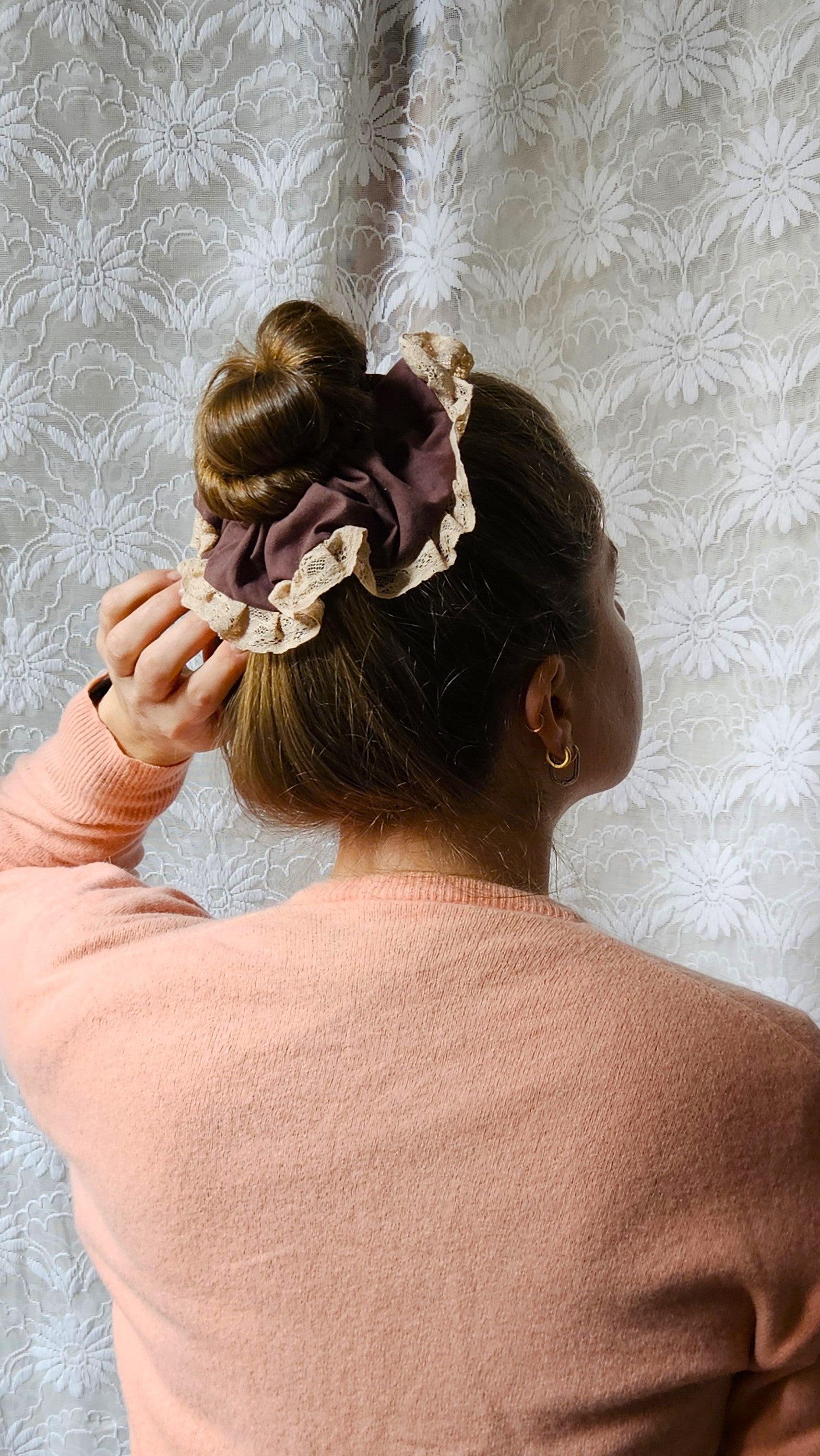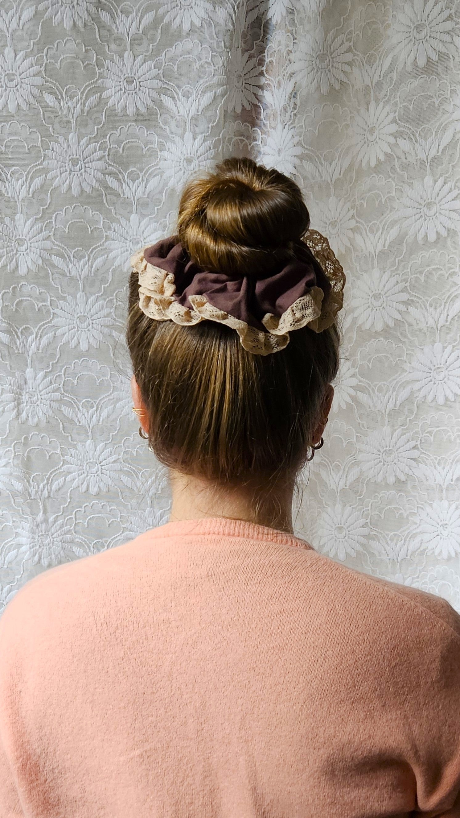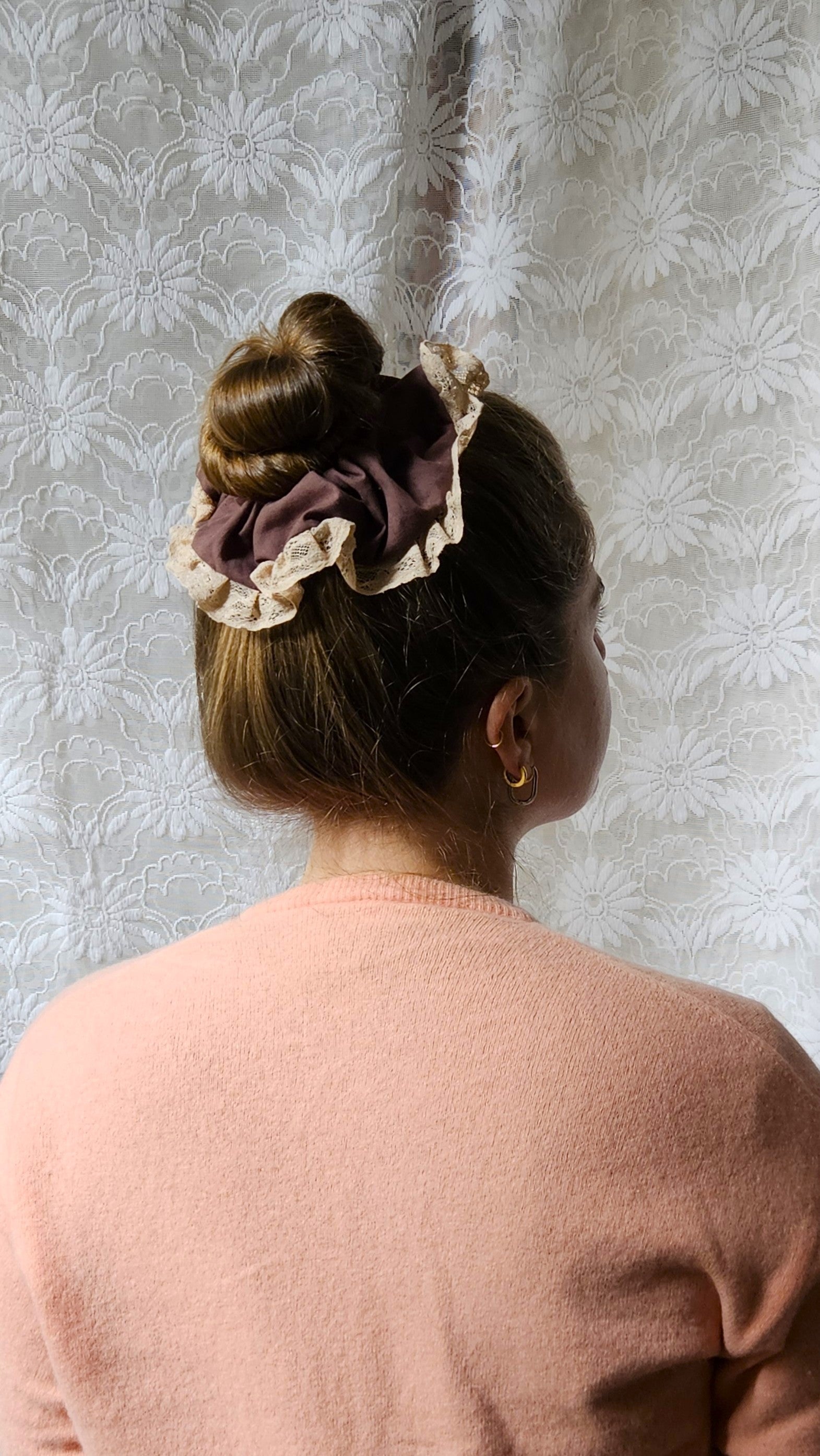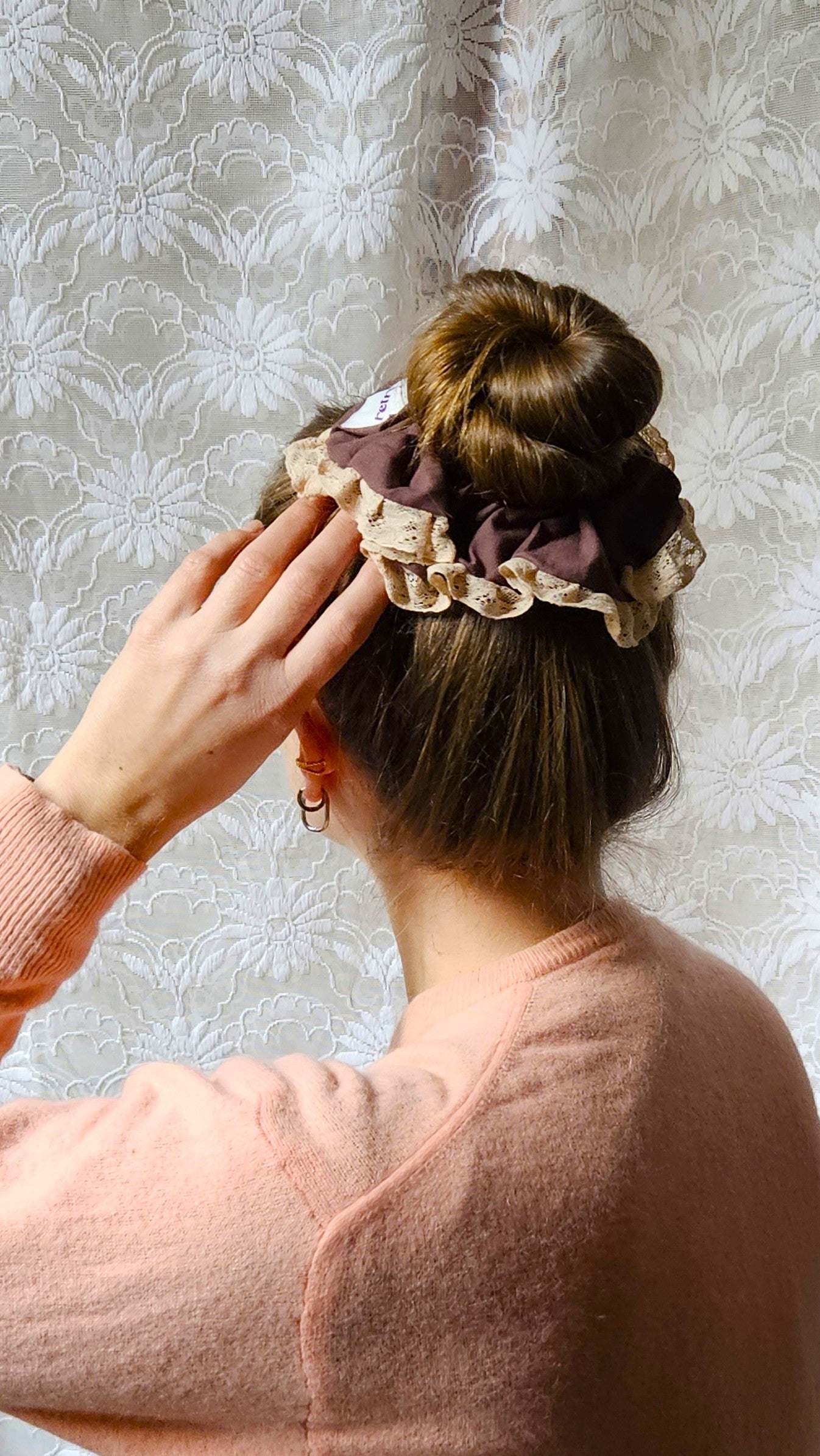 Chouchou XL créé à partir d'un drap et d'une dentelle vintage.