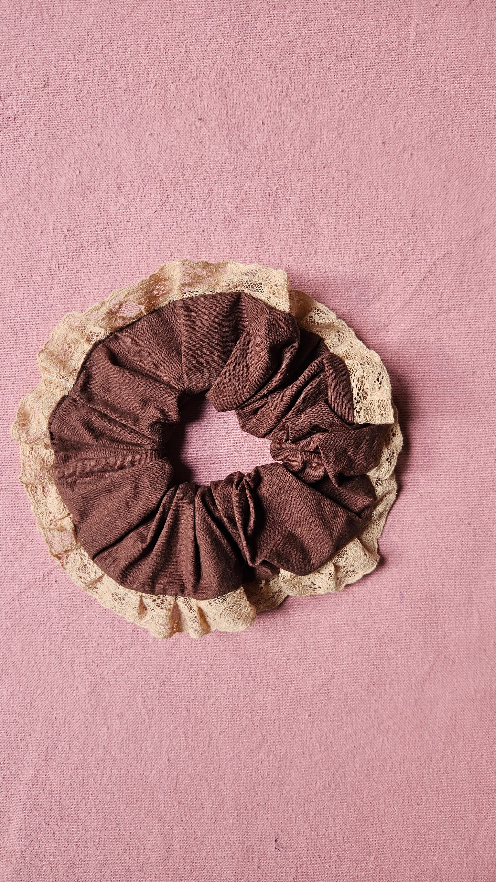 Drap marron, dentelle rose/chair